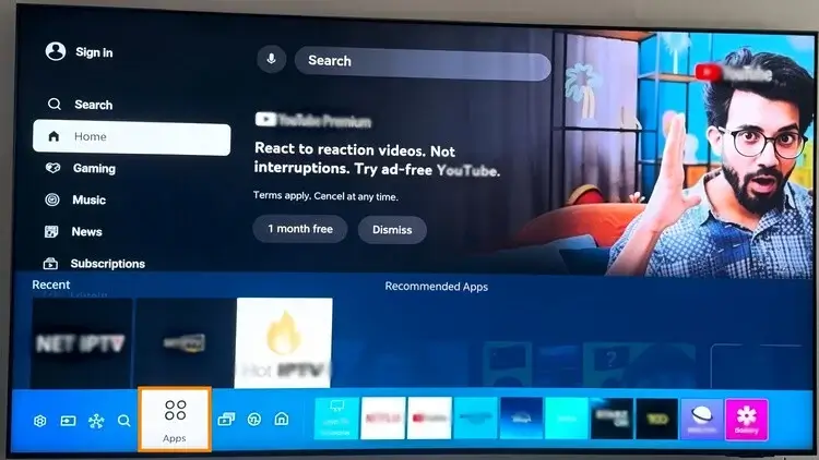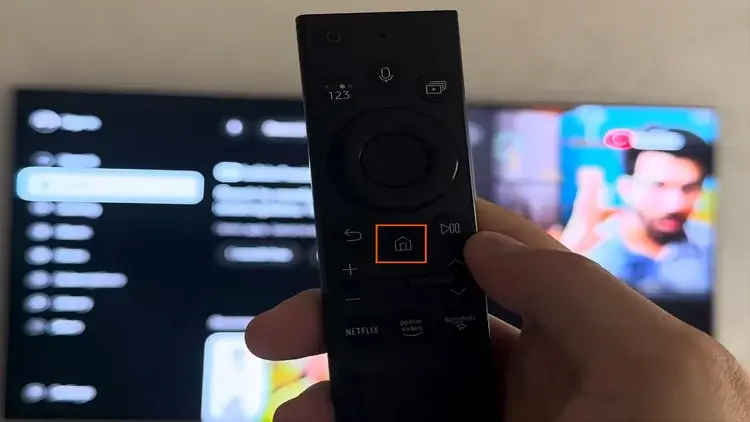 1 : Drücken Sie die Home-Taste (Haussymbol) auf Ihrer Samsung-Fernbedienung, um die Menüleiste am unteren Bildschirmrand aufzurufen.