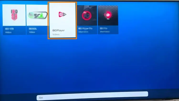 4 : Geben Sie „IBO Player“ über die virtuelle Tastatur ein und wählen Sie dann die entsprechende Anwendung aus, die in den Suchergebnissen erscheint.