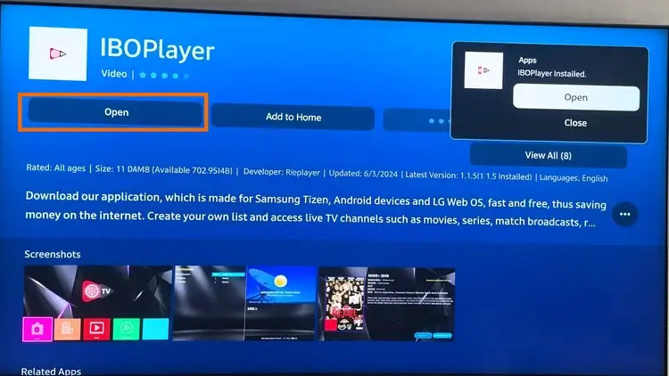 6 : Sobald die Installation abgeschlossen ist, wählen Sie die Schaltfläche „Öffnen“, um den IBO Player auf Ihrem Fernseher zu starten.